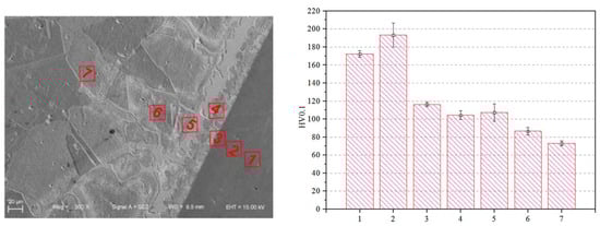 Generally speaking, as shown in Figure 10, it can be speculated that the hardness of the as-brazed SS/Cu joints reveals a downtrend from the SS to the copper side. The softest area is the base material on the copper side; 7# with a value of 76 HV. In contrast, the SS base material, point 2#, presents a peak hardness value of 193 HV. Point 1# shows a hardness value of 173 HV, which is slightly lower than point 2#. Turning to point 3#, the interface of the SS side, the hardness value indicated a sharp decrease to 116HV. Then at point 4#, the hardness value of the interface area of the brazing seam layer leveled off at around 104 HV. Apart from the above, the hardness of the interface area on the copper side (5#), the copper-base metal Ag-rich eutectic penetrating area (6#) and copper base metal area without Ag-rich eutectic penetration (7#) are 107 HV,86 HV and 76 HV, respectively.