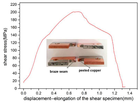 The shear strength test specimens, shear stress-displacement curve and SEM analysis of the fracture of the samples are illustrated in Figure 11 and Figure 12, respectively. As shown in Figure 11, the shear test of two samples revealed that the shear strength of the brazed joints is 202 MPa and 208 MPa, respectively. It can be found that the shear fracture presents a white color to the naked eye. It seems that the whole copper near the braze weld is torn off. At a closer look, the crack propagated along the copper side of the whole brazed joint. This demonstrates that the overall process conforms to the test results of the hardness test as shown in Figure 10. From the perspective of the microhardness distribution across the interface of the as-brazed SS/Cu joint, the coarse grain of the copper indicated the lowest hardness value. Therefore, this zone is the most vulnerable zone of all of the joints and is the crack initiation point and the weakest area of the whole joint.