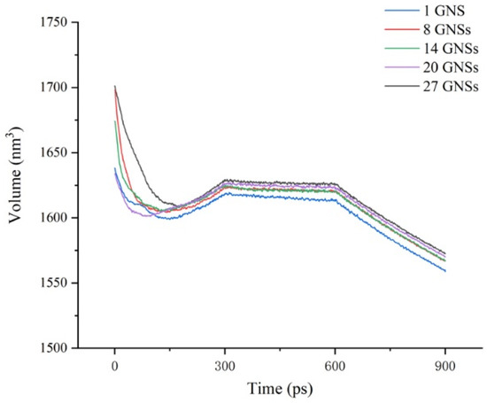 The sintering process of metal-graphene system has been investigated deeply in simple MD models, which are built with only one sheet of graphene and several metal particles [23,27]. Here, the Al/graphene composite are achieved with a different number of GNSs in a larger scale. The details in powder metallurgy such as plastic deformation and mass flow can be observed similarly in Figure 2. This densification process can be monitored by the change in volume and morphology. Because there is a large space for the insertion of graphene, the initial system volumes after relaxation are different. Since the particles are not close to each other, the system volumes drop sharply at first in the heating stage, followed by an increase owing to the thermal expansion. Then, the stable pressure and temperature compresses the structures slowly, and the final structures are obtained after cold shrink in the cooling stage.