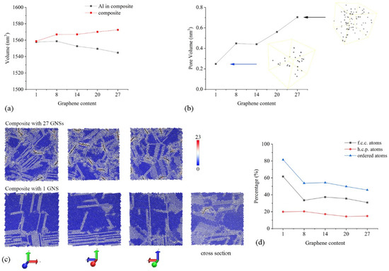 The volume fraction of Al atoms in a composite can be easily figured out in MD simulations to explore the effect of graphene on inner structures. As reported, graphene can promote the densification of metal matrix composite [28]. So, it can be confirmed by that Al volume in composites decreases from 1558 nm3 to 1544 nm3 in Figure 3a, with the growth in the number of GNSs, while the total volume of composite increases from 1559 nm3 to 1573 nm3. In the scale of this study, the interspaces between atoms bigger than a spherical diameter of 4 Å is defined as pores. However, the porosity of composite visibly reveals that more GNSs give rise to formation of nanopores, and the total volume of nanopores increase from 0.248 nm3 to 0.704 nm3, according to the images and trends in Figure 3b. There is no contradiction here, because the volume of nanopores beside GNS is partly regarded as the Al volume, which is computed by calculating the Voronoi tessellation of each atom. For further analysis of the structure, centro-symmetry parameter (CSP) analysis is performed on sintered composites. The local lattice disorder can be clearly displayed in CSP values from 0 (perfect lattice) to 2.3 (surface atoms). That is to say, blue areas stand for Al atoms with perfect lattice, white areas represent defects such as grain boundaries, and red atoms imply nanopores. In spite of the random in crystal orientation of initial Al particles, Al grains with large sizes are formed in the sintering process, since several big blue areas can be observed in Figure 3. Obviously, the size of Al grains reduce with the rise in the number of GNSs (Figure 3c). It should be noted that the GNSs are located at the Al grain boundaries in all the models, which is consistent with metal matrix composite prepared by experimental methods [11,29]. At the interface between Al and GNS, Al atoms on both sides of graphene are expected to be organized in the {111} facet of the face-centered cubic (f.c.c.), facilitating the crystallization of metal atoms [27,28,29,30]. So, Al atoms beside GNSs may be considered as the hexagonal close-packed (h.c.p.) order. However, the lattice parameter for the close-packed plane of Al grain is a little bigger than the size of the honeycomb lattice of graphene, and GNSs in composite almost present the blending state. Thus, it is impossible for Al atoms beside graphene to form perfect lattice. With the growth in graphene content, more Al atoms affected by graphene lead to the extension in grain boundaries and the decrease in the size of Al grains. Common neighbor analysis (CNA) is operated to count the number of atoms arranged with f.c.c. or h.c.p. order, and both of them are classified into ordered atoms, because f.c.c. atoms can be considered as atoms with perfect lattice, h.c.p. atoms may be considered as stack fault. Since the total number of Al atoms in every model is 96,255 (=3565 × 27), the percentage of order atoms can be calculated easily. As expected in Figure 3d, the composite sintered form the same system with less GNSs has more f.c.c., h.c.p., and ordered atoms, and the percentage of ordered atoms drops from 81.5% to 45.7% with the increment of GNSs. Nevertheless, the change in the number of atoms organized in the h.c.p. order is tiny, which means that Al atoms arranged in close-packed plane on both sides of graphene has not formed h.c.p. structures eventually. Therefore, it is concluded that graphene can restrict the metal grain size rather than facilitate metal crystallization.