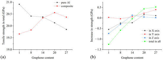 To verify the direct strengthening in graphene-reinforced composite, tensile simulations are conducted on the designed models above. In view of the two-dimensional properties and random orientation of graphene, both the composite structures and unreinforced structures are stretched in three directions, and the total tensile strength is defined as the sum of tensile strength for the three directions. As shown in Figure 5a, the total tensile strength of pure Al structures decreases from 20.9 GPa to 19.8 GPa, that is in line with inverse hall-patch relation which brings a drop with the reduction in grain size [31]. The total tensile strength of composite rises from 19.7 GPa to 20.4 GPa, implying that graphene is helpful for the improvement of mechanical property. However, composite containing less GNSs seems to have no advantage on tensile strength, and even the composite with only one GNS becomes softer obviously in two directions. This means that the direct strengthening of graphene may have a negative effect on mechanical property when graphene content is low. When the number of GNSs increase to 14, the composites become stronger at a certain direction, suggesting that the tensile property is in relation to the orientation of GNSs. After the number of GNSs exceeds 20, the tensile property of composite has been improved thoroughly, but there is a clear gap between the increments in different directions. As a whole, Figure 5b reveals that the tensile strength is raised only 2.7% on average (total about 0.5 GPa for three directions), even with the highest graphene content. The structures containing 27 GNSs here is equivalent to the composite with 2.4 wt.% graphene experimentally. Whereas the tensile strength can be improved 45% at least in experiments with only 0.54 wt.% graphene [2,3,4], where grain refinement may play a more important part. Thus, it can be concluded that the direct strengthening of graphene is much lower than the indirect effect.
