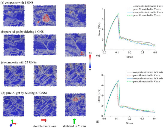 In Figure 6, the CSP images under different strains present the changes in inner structure in the tensile process, and the models with 1 and 27 GNS are selected to observe the direct strengthening behavior of graphene. As commonly believed, the dislocation in metal grains moves under tensile deformation, eventually absorbed by grain boundaries [15,32]. If graphene content is low, most grain boundaries are not reinforced by graphene. When stretched in the y-axis, the initial crack in the composite is formed at the same location in pure Al bulk with a similar structure, and the crack propagates the path is far away from graphene (Figure 6a,b). Thus, the almost equal values of tensile strength are measured (Figure 6e). When stretched in x-axis, GNS seems to hinder the plastic flow of adjacent Al atoms, leading to stress concentration that accelerate the formation of cracks. Thus, the tensile strength of pure Al is bigger than that of composites combined with larger elongation at failure. If graphene content is high, most grain boundaries are strengthened by graphene. The initial crack in composite may originate from the same void too, as shown in Figure 6c,d, and there is no visible gap between the tensile strength of pure Al and composite (Figure 6f), when stretched in the x-axis. However, a great number of GNSs can give rise to global enhancement in structure, leading to a different route for crack extending, so the tensile property of composite has been largely improved in the y-axis. To sum, the direct effect of graphene shows an obvious anisotropy, low graphene content may weaken the composite in some directions, while high graphene content can strengthen the composite in more directions.