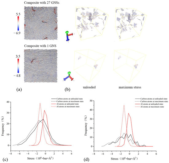 The atomic stress of Al atoms and GNSs. The images of stress distribution in (a) Al atoms and (b) GNSs, (c) the stress distribution of atoms in composite with 27 GNSs, and (d) the stress distribution of atoms in composite with 1 GNS.