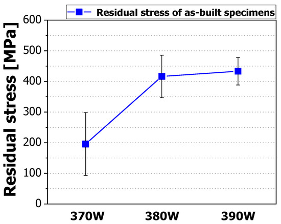 The thermal stresses generated during the L-PBF process can persist elastically even after plastic deformation occurred during rapid cooling [25,26,27,28,29]. This residual stress was measured in the bottom region of specimens fabricated under conditions of 370 W, 380 W, and 390 W, with the corresponding results depicted in Figure 4. It was observed that all measured specimens exhibited tensile residual stress, and as the laser power increased from 370 W to 390 W, with a 20 W increment, the residual stresses escalated from 195.6 MPa to 433.3 MPa. This result indicates the occurrence of higher thermal stresses with increasing laser power.