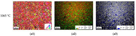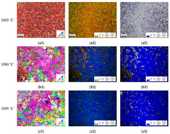 EBSD images for 390 W specimens with different stress-relief heat treatment temperatures: (a1,b1,c1) inverse pole figure map; (a2,b2,c2) kernel average misorientation map; (a3,b3,c3) image quality map with highlighting GOS under 1 degree.