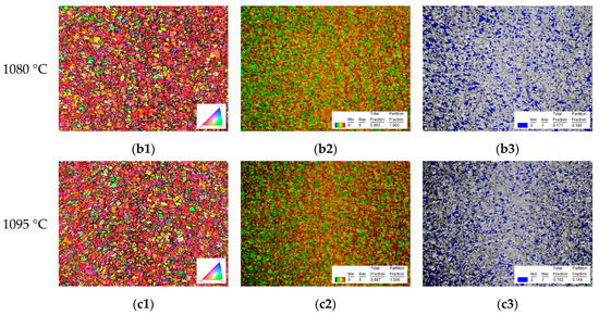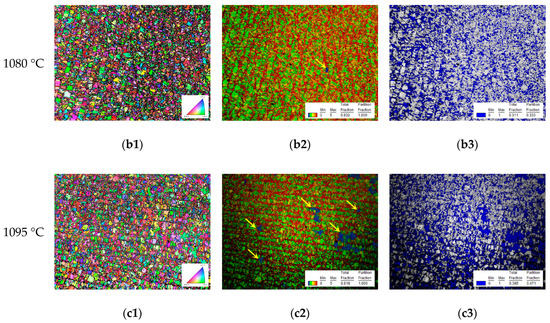 Similarly, specimens manufactured using a laser power of 380 W underwent heat treatment at the same three temperatures, and the resulting EBSD microstructure observations are displayed in Figure 6. Under the 380 W condition, the laser scan path remained clearly visible across all heat treatment conditions. The average KAM values for the entire map were found to be 3.103, 3.104, and 2.796, respectively, as the temperature increased. Notably, after heat treatment at 1080 °C and 1095 °C, the occurrence of local recrystallization became evident, as indicated by the yellow arrows in Figure 6a1–b3. Additionally, the recrystallized grain fractions based on the GOS values measured at 1065 °C, 1080 °C, and 1095 °C were 41.4%, 33.3%, and 47.1%, respectively. It is inferred that the recrystallization temperature for specimens under the laser power condition of 380 W approaches 1095 °C.