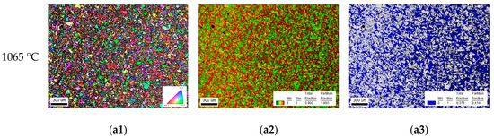 On the other hand, the specimens produced with a laser power of 390 W maintained a lower recrystallized grain fraction of 10.3% after heat treatment at 1065 °C, as shown in Figure 7. In contrast, after heat treatment at 1080 °C and 1095 °C, a significant increase in the fraction of recrystallized grains can be found with values of 85.4% and 94.4%, respectively. As recrystallization progressed, the average KAM value within the measured area exhibited a significant decrease, reaching 3.332, 0.962, and 0.351 for 1065 °C, 1080 °C, and 1095 °C, respectively. Hence, it was confirmed that under the laser power condition of 390 W, the recrystallization temperature of the specimen exists between 1065 °C and 1080 °C.