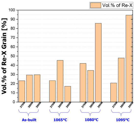 Figure 8 demonstrates the fraction of recrystallized grain as a function of laser power and heat treatment temperature. By considering the recrystallization condition as when more than 50% of the measured area is converted to recrystallized grains, recrystallization occurred only at 1080 °C and 1095 °C after heat treatment under 390 W. Thus, it can be inferred that the recrystallization temperature is above 1095 °C for a laser power of 370 W, approximately 1095 °C for a laser power of 380 W, and between 1065 °C and 1080 °C for a laser power of 390 W.