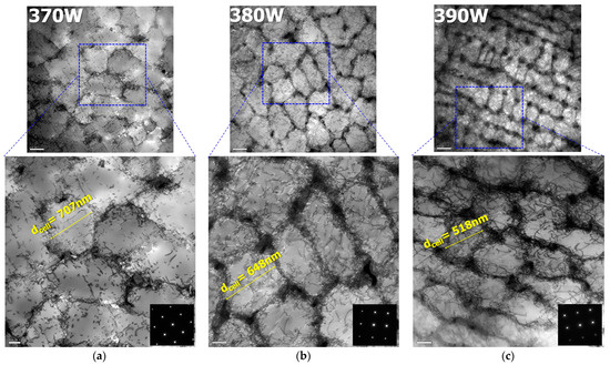 To verify this, TEM observation of the as-built specimens at different laser powers were carried out and are presented in Figure 9. By setting the zone axis to <001>γ, the average cell size was measured, resulting in 707 nm for 370 W, 648 nm for 380 W, and 518 nm for 390 W. These measurement correspond to the increasing trend in heat dissipation of the melt pool with higher laser power, suggesting a faster cooling rate. Additionally, the presence of the dislocation cell structure formed at the cell boundaries was observed. This dislocation cell structure is known to form as a result of repetitive heating and cooling, which leads to tensile and compressive deformation even after solidification. Notably, it can be clearly observed that the dislocation density formed at the cell boundaries increases with increasing laser power.