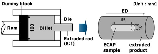 The commercial and CaO-added AZ31 alloys were subjected to ECAP in this study. The chemical composition of each alloy was analyzed using inductively coupled plasma mass spectrometry (ICP-MS, Thermo Fisher Scientific, Dover, DE, USA), and the results are listed in Table 1. Billets with a diameter of 100 mm were produced via direct-chill casting and extruded with an extrusion ratio of 8:1. Subsequently, the samples for ECAP (diameter = 10 mm, height = 65 mm) were machined from the extruded rods (Figure 1).