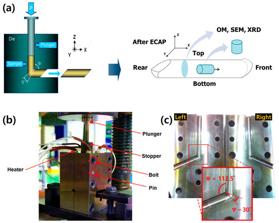 ECAP was performed using a Shimadzu UH-X 1000 kN universal testing machine (Shimadzu, kyoto, Japan) at a strain rate of 1 mm∙s−1. A separable-type mold with an internal channel was utilized for ECAP. The dimensions of the die used for ECAP were length of 100 mm × width of 105 mm × height of 175 mm. The angle (Φ) of the internal channel was 112.5°, and the corner angle (Ψ) was 30° (Figure 2). The strain (ε) was calculated as follows (ε1 = 0.75) [29]: