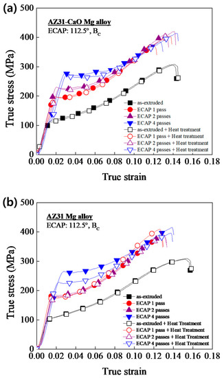 True stress–strain curves of the ECAPed: (a) CaO-added AZ31 and (b) commercial AZ31 alloys with and without heat treatment after the compression tests.