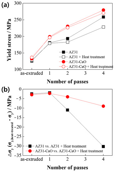 Comparison of the mechanical properties as a function of the number of ECAP passes between the ECAPed CaO-added AZ31 and commercial AZ31 alloys after the compression tests: (a) yield stress and (b) change in the yield stress, Δσy, of the AZ31 alloys after heat treatment.