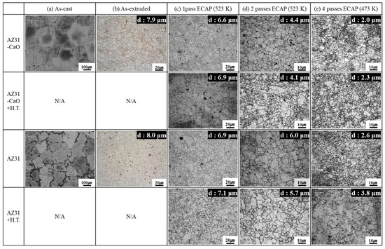 Optical micrographs of the microstructures in the: (a) as-cast sample, (b) as-extruded sample, (c) ECAPed sample (1 pass) at 523 K, (d) ECAPed sample (2 passes) at 523 K, and (e) ECAPed sample (4 passes) at 473 K of the CaO-added AZ31 and commercial AZ31 alloys with and without heat treatment. The average grain size is presented in the top-right corner of each image.