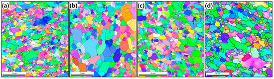 Electron backscattered diffraction (EBSD, JEOL Ltd., Tokyo, Japan) scans were performed over an area of 50 µm × 50 µm (step size = 0.1 µm); thus, the changes in the microstructure and texture of the samples due to ECAP and heat treatment were observed. The ECAPed samples were mechanically polished and subjected to Ar ion milling to clean and eliminate the deformed surfaces and the oxidized layer that were generated during mechanical polishing. The raw data from the EBSD analysis were obtained using the TSL-OIM software (OIM Analysis™, AMETEK, Inc., Berwyn, PA, USA).