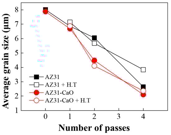 The average grain sizes of the alloys were measured using the OM images (Figure 7) to quantitatively analyze the influence of the added CaO on the grain growth due to heat treatment. The average grain sizes of the as-extruded CaO-added AZ31 alloy and commercial AZ31 alloy were 7.9 and 8.0 µm, respectively. The average grain sizes of the as-extruded CaO-added AZ31 alloy and commercial AZ31 alloy gradually decreased to 2.0 and 2.6 µm, respectively, with an increase in the number of ECAP passes. The average grain sizes of the ECAPed (four passes) CaO-added AZ31 alloy and ECAPed (four passes) commercial AZ31 alloy increased from 2.0 to 2.3 µm and 2.6 to 3.8 µm, respectively, owing to heat treatment. Thus, the increase in the grain size of the commercial AZ31 alloy was four times larger than that of the CaO-added AZ31 alloy.