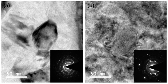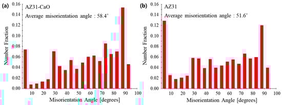 Figure 8 shows the bright-field TEM images and selected area diffraction patterns (SADP) of the CaO-added AZ31 and commercial AZ31 alloys. The ring pattern in the SADP is a typical feature of nanostructured materials that are fabricated by severe plastic deformation [31]. The ring pattern of the CaO-added AZ31 alloy was more prominent than that of the commercial AZ31 alloy; furthermore, the number of spots in the ring pattern of the CaO-added AZ31 alloy was higher than that in the ring pattern of the commercial AZ31 alloy. This indicated the formation of ultrafine grains in the CaO-added AZ31 alloy during four ECAP passes; moreover, the number of grains that were formed in the CaO-added AZ31 alloy was higher than that in the commercial AZ31 alloy during four ECAP passes. This appeared to be consistent with the distribution of the misorientation angle that was determined from the EBSD analysis. The histogram of the distribution of the misorientation angle (Figure 9) showed that the number fraction of the high-angle grain boundaries (misorientation angle > 15°) in the CaO-added AZ31 alloy was approximately 11% higher than that in the commercial AZ31 alloy.