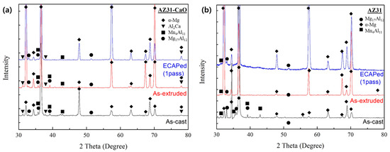 The second-phase particles significantly impacted the mechanical properties and the microstructural evolution of the AZ31 alloys. Therefore, the distribution of the second-phase particles in the CaO-added AZ31 and commercial AZ31 alloys was investigated. The results of the XRD analysis (Figure 10) showed the formation of Mg17Al12 and Al11Mn4 in both the alloys; however, Al2Ca was detected only in the CaO-added AZ31 alloy due to the presence of CaO. Figure 10 shows that the second-phase particles were formed during casting and existed during extrusion and ECAP.