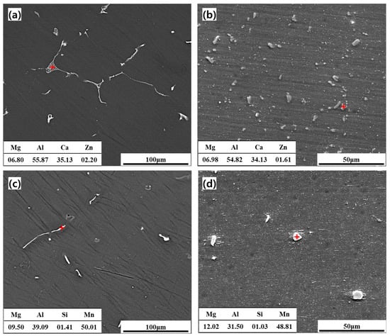 Figure 11 shows the shape and distribution of the second-phase particles in the CaO-added AZ31 and commercial AZ31 alloys. The XRD results showed that Al2Ca was distributed only in the CaO-added AZ31 alloy. Rod-shaped particles of Al2Ca were formed along the grain boundaries in the cast sample of the CaO-added AZ31 alloy (Figure 11a). The presence of fine, spherical particles of Al2Ca in the extruded sample of the CaO-added AZ31 alloy indicated the fragmentation of Al2Ca during extrusion. Rod-shaped and spherical particles of Al11Mn4 were observed in the cast and extruded sample, respectively, of the commercial AZ31 alloy. Furthermore, the higher volume fraction of the second-phase particles in the CaO-added AZ31 alloy as compared to that in the commercial AZ31 alloy was attributed to the addition of CaO.