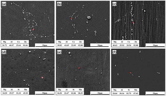 Scanning electron micrographs of the second-phase particles in the: CaO-added AZ31 alloy after (a) one pass, (b) two passes, and (c) four passes of ECAP and commercial AZ31 alloy after (d) one pass, (e) two passes, and (f) four passes of ECAP. The chemical compositions (wt.%) of the marked second-phase particles are listed in the table in the bottom-left inset of each figure.