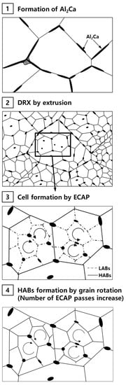 Schematic of the grain refinement mechanism for the ECAPed CaO-added AZ31 alloy. (1) Formation of Al2Ca, (2) DRX by extrusion, the low-angle boundaries and high-angle boundaries in (3) are abbreviated as LABs and HABs, (4) HABs formation by grain rotation, respectively.