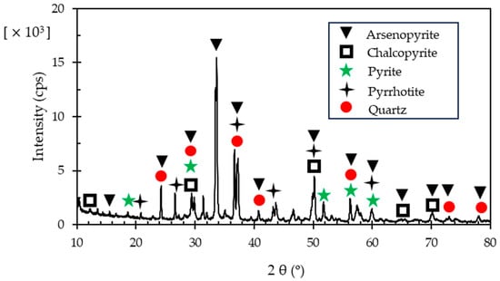 The HAsBS sample was supplied by Kitabita Mine, Yamaguchi Prefecture, Japan. Table 1 shows the chemical composition of the HAsBS sample determined using the X-ray fluorescence spectrometer (XRF, EDXL300, Rigaku Corporation, Tokyo, Japan). Quantitative X-ray diffraction (XRD, Multiplex, Rigaku Corporation, Tokyo, Japan) analysis result (Figure 1) showed that the HAsBS sample was composed of arsenopyrite, chalcopyrite, pyrite, pyrrhotite, and quartz.