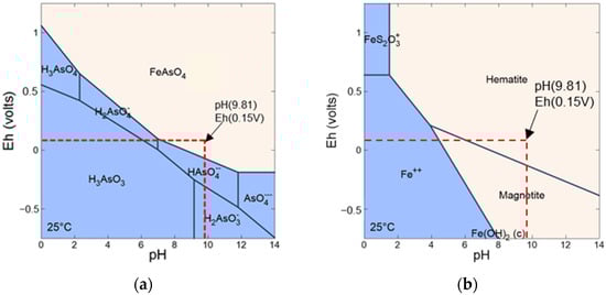 Eh–pH diagram of the (a) Fe–As–S–H2O system, (b) Fe–S–H2O system. (Concentrations of Fe, As, and S were taken to be 0.001 mg/L, 0.001 mg/L, and 0.1 mg/L.)