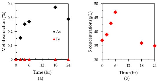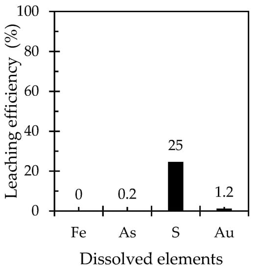 For the pre-oxidation, a solution containing 0.5 M NH3, 0.5 M NH4Cl, and 100 mM CuCl2 was used in which the cupric ammine complex was the oxidant for HAsBS. From Equations (6) and (7), it is expected that iron and arsenic species are precipitated during the oxidation of HAsBS. As shown in Figure 11, after 24 h of pretreatment in an ammonium solution containing cupric ions, about 25% of the sulfur dissolved, but almost no iron and arsenic species were detected in the solution as expected. Because the solution used in the pre-oxidation did not contain thiosulfate, gold extraction in the pre-oxidation step was small (about 1%).