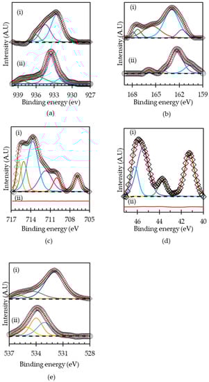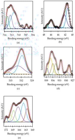Figure 14 shows the XPS results for the residue from pre-oxidation. In the Fe 2p3/2 spectrum, Figure 14a shows two peaks at 708.2 eV and 711.4 eV, and both were assigned to Fe(III)−O [54,55]. In the deconvoluted results of the As 3d5/2 spectrum, (Figure 14b), two peaks were detected at 45.6 eV and 47.3 eV, corresponding to As(III)−O and As(V)−O, respectively. In the O 1s spectrum, Figure 14d, on the treated HAsBS, a peak at 532.3 eV, which corresponds to the hydroxyl oxygen (OH−), was detected. These results are consistent with the hypothesis that ferric arsenate (FeAsO4) and ferric oxyhydroxide (FeOOH) are present as oxidation products of arsenopyrite and pyrite.
