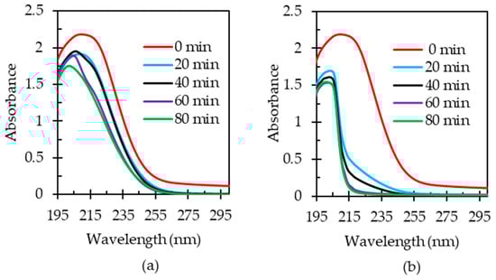 In the previous section, the formation of a passivation layer on gold with HAsBS and its effects were discussed. Another possible mechanism for the low gold extraction is thiosulfate decomposition induced by sulfide minerals. Therefore, the stability of thiosulfate in the presence of HAsBS was evaluated using UV–Vis spectral analysis to confirm thiosulfate decomposition by HAsBS. The UV–Vis spectral analyses for 0.5 M NH4Cl/0.5 M NH3 buffer solutions containing 100 µM of sodium thiosulfate or sodium sulfate are shown in Figure 7. Thiosulfate gave a strong absorbance peak at 214–216 nm, which is in line with previous reports [52,53]. The absorbance for sulfate ions was very low in the measured range (190–290 nm), and thus it can be assumed that absorbance at 215 nm (Abs215) corresponds to thiosulfate.