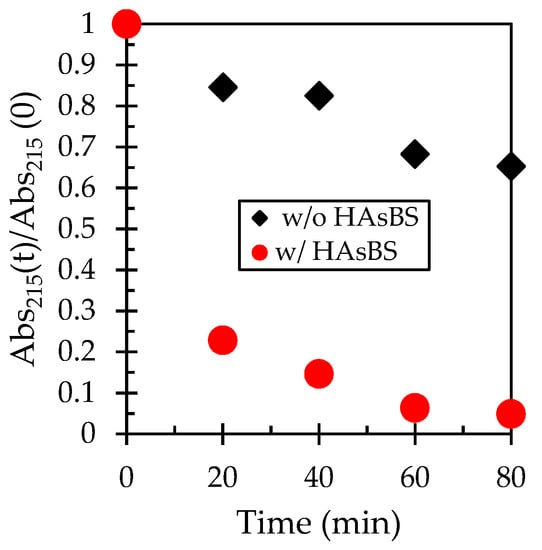 UV−Vis spectra thiosulfate decay of the (Abs215) absorbance for thiosulfate with and without HAsBS.