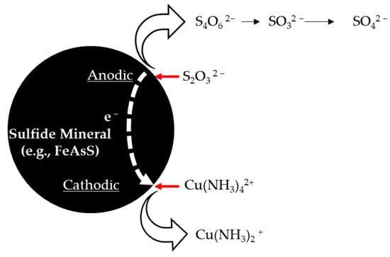 In the overall reaction of gold dissolution (Equation (4)), copper ammines (Cu(NH3)42+/(Cu(NH3)4+) do not appear, and they are considered to be a catalyst for gold extraction. In the solution phase, the decomposition of thiosulfate occurs; that is, thiosulfate ions are oxidized by the cupric ammine complex to form tetrathionate (S4O62−) as follows [31,32]: