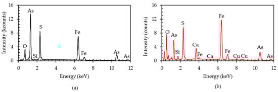 The SEM–EDX analysis to evaluate the insulating layer formation on HAsBS after pretreatment for 24 h is shown in Figure 12. The morphology of the HAsBS before and after pre-oxidation shows that the HAsBS surface changed from smooth to “pitted”, and it was also confirmed that precipitates were attached to the HAsBS surface after pre-oxidation. From EDX mapping for the residue, Fe, As, S, and O were evenly distributed on the mineral grain. The intensity of oxygen in the EDX spectrum (Figure 13) was higher in the residues as compared to the HAsBS particles before leaching. The stronger oxygen peak for the residue may be attributed to the formation of FeAsO4 adsorbed on the ferric oxyhydroxides precipitated from the oxidation of HAsBS (Equation (8)). Weak copper signals were also detected on the HAsBS leach residues, which might indicate the formation of Cu(I)-sulfide precipitates on the mineral surface as shown in Figure 12(b-5).