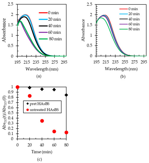 The effects of pre-oxidation were assessed in the previous section (Section 3.5.1), and it was found that a passivating layer, which comprised of oxidation products, formed on the surface of HAsBS. In this section, the effect of the pretreatment (pre-oxidation) of HAsBS on thiosulfate decomposition was evaluated using UV–Vis analysis (Figure 15). From the UV–Vis spectra of the thiosulfate solution, which had reacted with untreated HAsBS, the adsorption at 215 nm (Abs215) decreased drastically with time, while the rate of decrease became slower when the thiosulfate solution was reacted with pretreated HAsBS. The decay of absorbance with pretreated HAsBS was almost the same as that without HAsBS. These results confirmed that pre-oxidation of HAsBS, forming a passivating layer on its surface, was effective as a way to minimize the decomposition of thiosulfate.