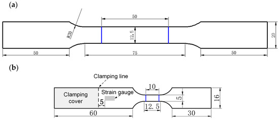 A total of 2 types of uniaxial tension tests, namely the static and dynamic tests, were performed in this paper, as shown in Table 1. The static tension tests were conducted at the strain rates of 0.001/s, according to the Chinese National Standard GB/T228.1-2010 “Metallic materials—Tensile testing—Part 1: Method of test at room temperature” [30]. The dynamic tension tests were conducted at 5 strain rates, namely 0.1, 1, 10, 100, and 500/s, according to the International Standard ISO 26203-2-2011 “Metallic materials—Tensile testing at high strain rates—Part 2: Servo-hydraulic and other test systems” [31]. The dimensions of the specimens for static and dynamic tests are shown in Figure 1a and Figure 1b, respectively.