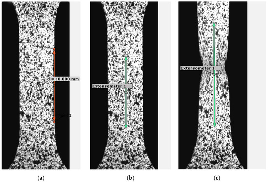 DIC measurement; (a) Virtual installation of a scale bar; (b) Establishment of the virtual extensometer; (c) Measurement of the deformation by the virtual extensometer.