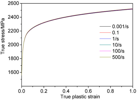 The fitted and extrapolated curves using the Swift + Hockett–Sherby constitutive function are shown in Figure 5. It can be clearly seen in Figure 5 that with the increase in strain rate, the tensile strength of the PHS2000 steel shows a slowly increasing trend, which means that the material has a low strain sensitivity. Moreover, the curves at different strain rates do not intersect with each other, meeting the requirements for the engineering analysis.