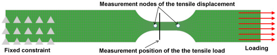In order to verify the validity of the true stress-strain curve obtained by fitting, the same loading conditions were used for modeling and simulation. * BOUNDARY_PRESCRIBED_MOTION keyword was used to input the speed curve for loading. * DATABASE_CROSS_ SECTION_PLANE keyword was used to define a cross section for outputting the tensile load (black solid line in Figure 6). Two nodes at the parallel segment of the specimen were selected to define * DATABASE_HISTORY_NODE keyword (white nodes in Figure 6). The relative displacement between these two nodes was calculated to obtain the tensile displacement. After that, the simulated and experimental force-displacement curves were compared to implement benchmarking between experiments and simulations.