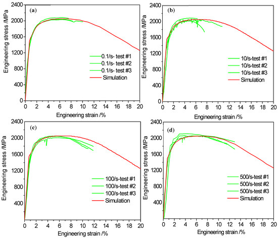 The material card was imported into the mathematical model of the high-speed tensile test for simulation calculation. The strain rate was set as 0.1, 10, 100, and 500/s. The comparison of the experimental and simulated engineering stress-strain curves is shown in Figure 7. It can be seen that the simulated curves coincide well with the experimental curves before the failure of the specimen, with a high simulation accuracy at each strain rate. In particular, when the strain rate is 0.1/s, as shown in Figure 7a, the average tensile strength of three experimental results is 2052.03 MPa. The simulated tensile strength is 2052 MPa, basically the same as the experimental value. The material card can meet the accuracy requirements for use. As the failure model was not defined in the card, the simulated curves deviates from the experimental curves after the fracture of the tensile specimen.