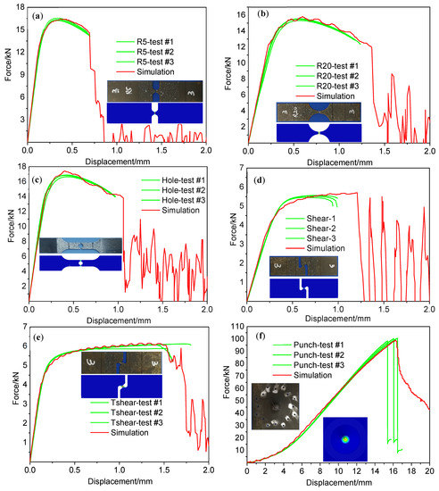 A total of 6 static tests under different stress states, namely R5-notched static tension, R20-notched static tension, center-hole tension, static tensile shear, static shear, and static punching, were simulated. The experimental and simulated results of the PHS2000 steel are shown in Figure 9a–f. In Figure 9, the red curves represent the simulated results and the green curves represent the experimental results. The simulation curve matches the experimental curve well in each test. The simulated and experimental results, such as failure time and failure position, are also close, which proves that the results are reliable.