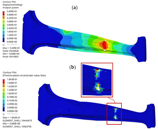Simulated results of three-point bending tests. (a) Displacement distribution at the time of failure; (b) distribution of effective plastic strain corresponding to the peak loading force.