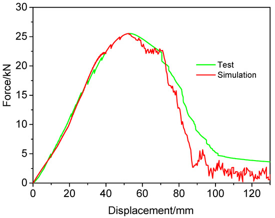 The experimental and simulated force-displacement curves of the 3-point bending test are shown in Figure 13. In Figure 13, the consistency between the experiment and simulation is excellent. The bending test starts when the pressure head contacts the B-pillar part. With the increase in displacement, the force increases. The fracture occurs when the loading force reaches the maximum value. After that, the loading forces decreases until the designed loading stroke is reached. The experimental and simulated force-displacement curves have the same changing trend. Especially before the fracture, the experimental and simulated curves almost coincide. After the fracture, the force becomes unstable and the the simulation curve deviates slightly from the experimental curve, which is caused by the generated fracture. However, overall, the changing trend of simulated force is consistent with the experimental one.
