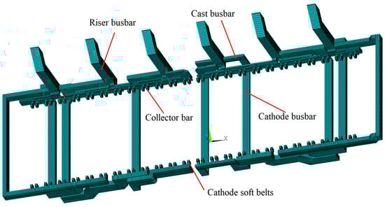 According to the design drawings of the 500 kA aluminum electrolytic cell busbar system, the busbar system was established, including the cathode busbar, the riser busbar, and the cathode soft belt. The calculation region was divided into hexahedral element through sweeping, and the key areas were refined to make the calculation results of the model more realistic. The computational mesh consists of 758,924 elements and 1,066,074 nodes. The geometrical model is shown in Figure 1 and some typical key parameters are shown in Table 1.