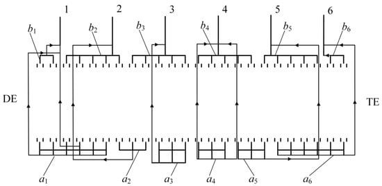 The cathode busbar configuration is shown in Figure 2. The number of the riser busbar from left to right is 1 to 6. Riser busbar No. 1 is close to the duct end (DE), and riser busbar No.6 is close to the tapping end (TE). The numbers of soft belts connected to each riser busbar from left to right on the power inlet side are represented by a1, a2, a3, a4, a5, and a6, and the numbers of soft belts connected to each riser busbar from left to right on the power outlet side are represented by b1, b2, b3, b4, b5, and b6.