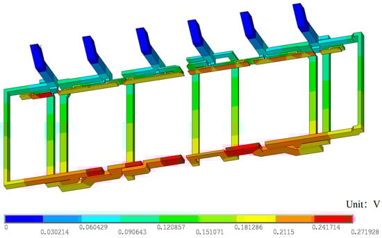 Figure 4 shows the potential distribution of the busbar system. It can be seen that the voltage drop of the entire busbar system is about 271.9 mV, which is close to the measured busbar voltage drop of 287.6 mV, with an error of 2.3%. Our model is also proved accurate in calculating the electric field distribution.