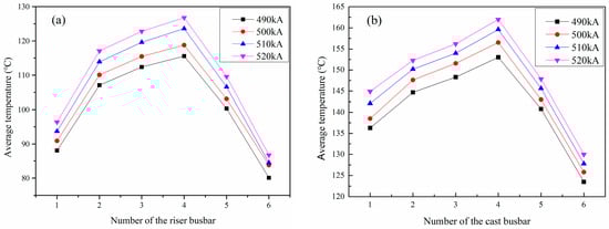 Figure 7 shows the temperature changes of the busbars under different current intensities. As can be seen from Figure 7a, with the increase in current intensity, the temperature rise of the riser busbar with high temperature is more evident than that of the riser busbar with low temperature, which further increases the temperature difference between the riser busbars. The maximum temperature difference between riser busbars increases from 35.5 °C at 490 kA to 40.0 °C at 520 kA. As seen from Figure 7b, when the current increases, the temperature rise of the cast busbars on side B is generally linear. Because the current density of the cast busbar is larger than that of the riser busbar, the temperature variation amplitude is not as sensitive as that of the riser busbar.