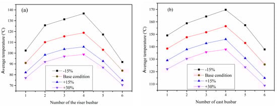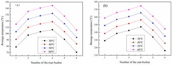 Figure 9 shows the change in the average temperature of the busbar at different positions with the heat transfer coefficient. It can be seen from Figure 9a that with the increase in heat transfer coefficient, the decreasing trend of the average temperature of the riser busbar is constantly slowing down. The higher temperature riser busbar is more affected by the heat transfer coefficient. As seen from Figure 9b, when the heat transfer coefficient increases, the average temperature of the cast busbar on side B decreases linearly.
