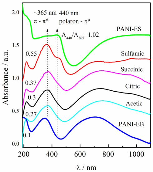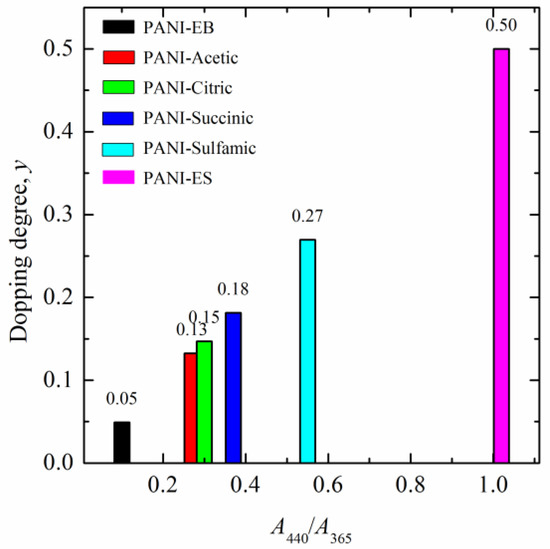 The determined average doping degrees of the reprotonated samples are shown in Figure 7. It can be seen that sulfamic-acid-doped PANI had an average doping degree of 0.27, PANI–succinic acid was 0.18, PANI–citric acid was 0.15, and PANI–acetic acid was 0.13.