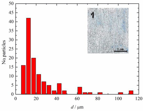 Figure 2 shows the particle size distribution in the composite coating of the polyaniline doped with sulfamic acid (shown in the inset of Figure 2) determined using ImageJ software. It can be seen that main particle sizes were approximately 13 μm, while some agglomerates had much higher dimensions, from approximately 20 μm up to 110 μm. The high agglomeration tendency of PANI is affected by the inflexibility in the conjugated double-bond backbone and is caused by the high density of electrical charges inside the conducting polymer matrix [33]. Consequently, it is difficult to make a proper dispersion of PANI in the classical organic polymer paint which is one of the main issues for possible applications.