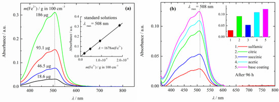 The UV–visible spectra of the standard test solutions are shown in Figure 3a. The linear dependence of the absorption of the standard solutions at 508 nm, shown in the inset of Figure 3a, is in agreement with the Beer–Lambert law. The dependence of the absorption at 508 nm over iron (iron ions) mass in grams, can be given as A508 = 1680 m(Fe2+). From Figure 3b and the inset, it can be seen that the maximum absorption that corresponds to the highest iron mass in the solution, was shown in the base coating, followed by that of composite coatings with polyaniline doped with acetic acid, citric acid, succinic acid, and finally sulfamic acid.
